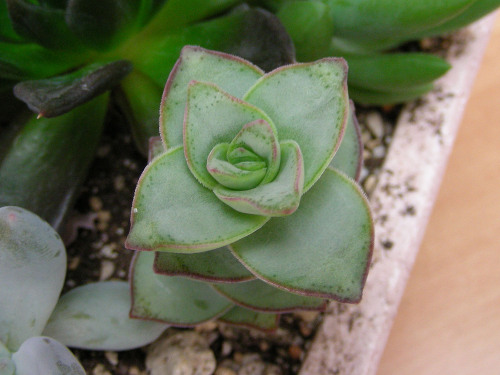 ◎memo:夏は水やりを減らす。株分け、茎の分割挿しで増やせる。中心部分より花芽を伸ばし薄ピンクの小さな花をつける。